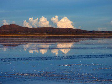 Uyuni is home to the salt flats of Bolivia, which are located in the middle of the country in the Altiplano. The local name is Salar de Uyuni. They are a rather large mass –– at 4,086 square miles, the world’s largest salt flats. The elevation is about 12,000 feet above sea level.