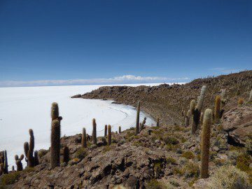 One of the things to do in Salar de Uyuni is to take a four-wheel-drive vehicle driven by a professional driver –– there are no rental cars available –– to take you across the salt lake to what they call islands. These basically are rock formations going through the salt, and one of them is home to numerous cacti. While you explore and climb to the top of it, remember you are at 13,000 feet MSL. It gives you the impression you are walking in the Rockies and overlooking a foggy valley.