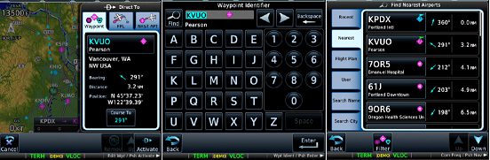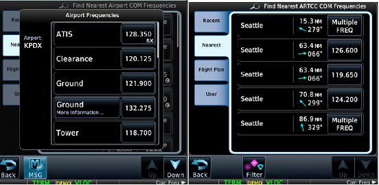 If you want to select a COM frequency, for example, push the Standby box to display the screen in Figure 1 (right) where you can enter a frequency with the number keys. But notice the Find key in the upper left, which gives you the four choices shown in the middle screen: Recent, Nearest, Flight Plan, and User. The Recent choice is presented by default. The following screens are for a flight plan from Portland to Salt Lake City; we are on the ground at Portland, the point from which Nearest items are assembled.