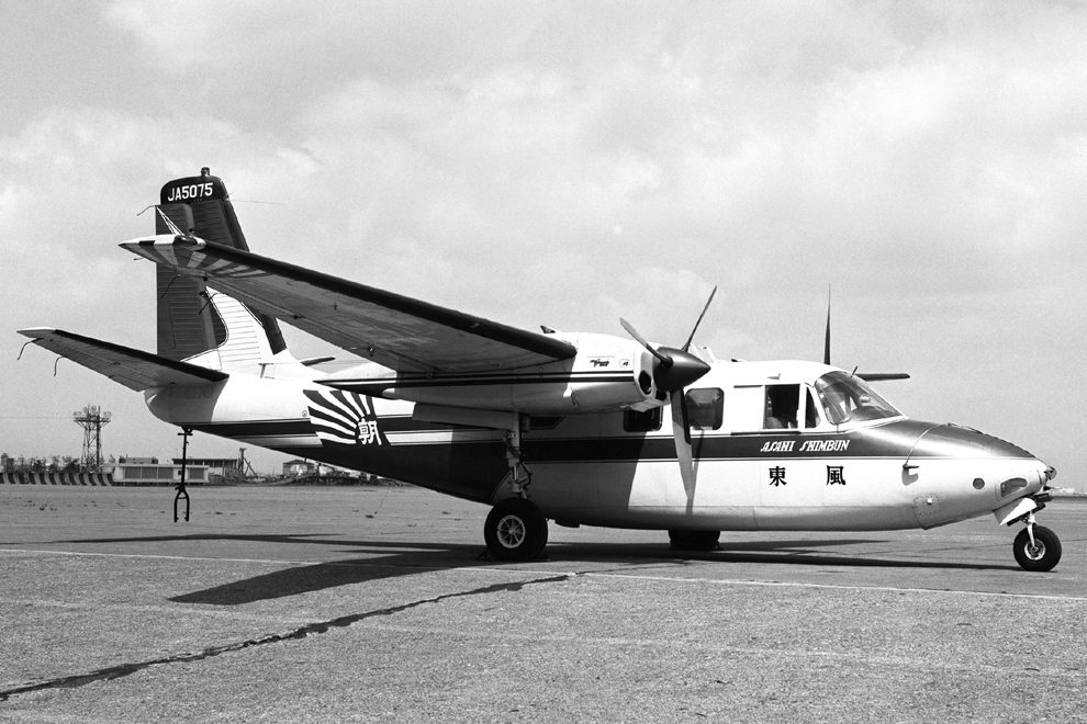 This photo, scanned from a factory negative, is of N78395, originally certificated on August 23, 1963 and painted in a special design in Bluetone White, Scarlet Bleeder Red, and Black. After being modified by installing a camera facility, it was delivered by Air Ferry International Inc., of Pacific Palisades, California, to Auckland, New Zealand, to the New Zealand Land & Survey Department of Hastings, which owned it jointly with NZ Aerial Mapping Ltd., whose logo can be seen underneath the pilot’s window. Also clearly seen at the front of the nacelle are three intakes.